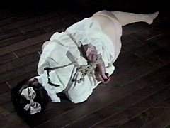 白いブラウスに黒いスカートをつけた艶麗藤さとみの細い可憐な手首がひとつに固く縛られ、縄が一本胸に回ります。その瞬間、縄に感じて陶○するさとみの愛らしさ、美しさ。緊○される恍惚と哀愁をこれほどまでに美しく可憐に表現してしまう女性は、緊美研の中でも上位に入ります。白い布の固まりを口の中に詰め込んで黒革布の強烈な猿轡、さらにその上から二重三重の白布の猿轡。縄尻を天井につなげての立ち縛り。黒いスカートを取ると白いパンストに包まれた形の良い細い脚。透けて見えるピンク色のショーツ。膝を曲げた形の片足吊りにすると、下着の繊細な陰影が剥き出しにされ、目も眩むような下着フェティシズムの世界が展開します。そして正座ポーズ。パンストを下ろされ、ショーツを剥き出しにされたさとみの羞恥の吐息と泣き声。左右の太腿のつけねを足枷のように麻縄で縛られ、ヨチヨチ歩きを命令されます。藤さとみの足の美しさ、官能的な下着緊○がたっぷりと楽しめる、31分間の味わい深い魅力の映像です。